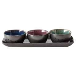 Das Tapas-Set von BITZ umfasst eine Tapas-Platte und drei Schalen aus Steinzeug. Alle Teile haben eine mattschwarze Glasur auf der Außenseite und eine glänzende, farbige Glasur auf der Innenseite. Die Glasur der Platte ist dunkelblau und die drei Schalen mit 12 cm Durchmesser haben eine Glasur in Grün, Lila und Dunkelblau auf der Innenseite. Geeignet für den Geschirrspüler und die Mikrowelle. Verträgt Temperaturen im Backofen bis 220 Grad und im Gefrierschrank bis minus 18 Grad.