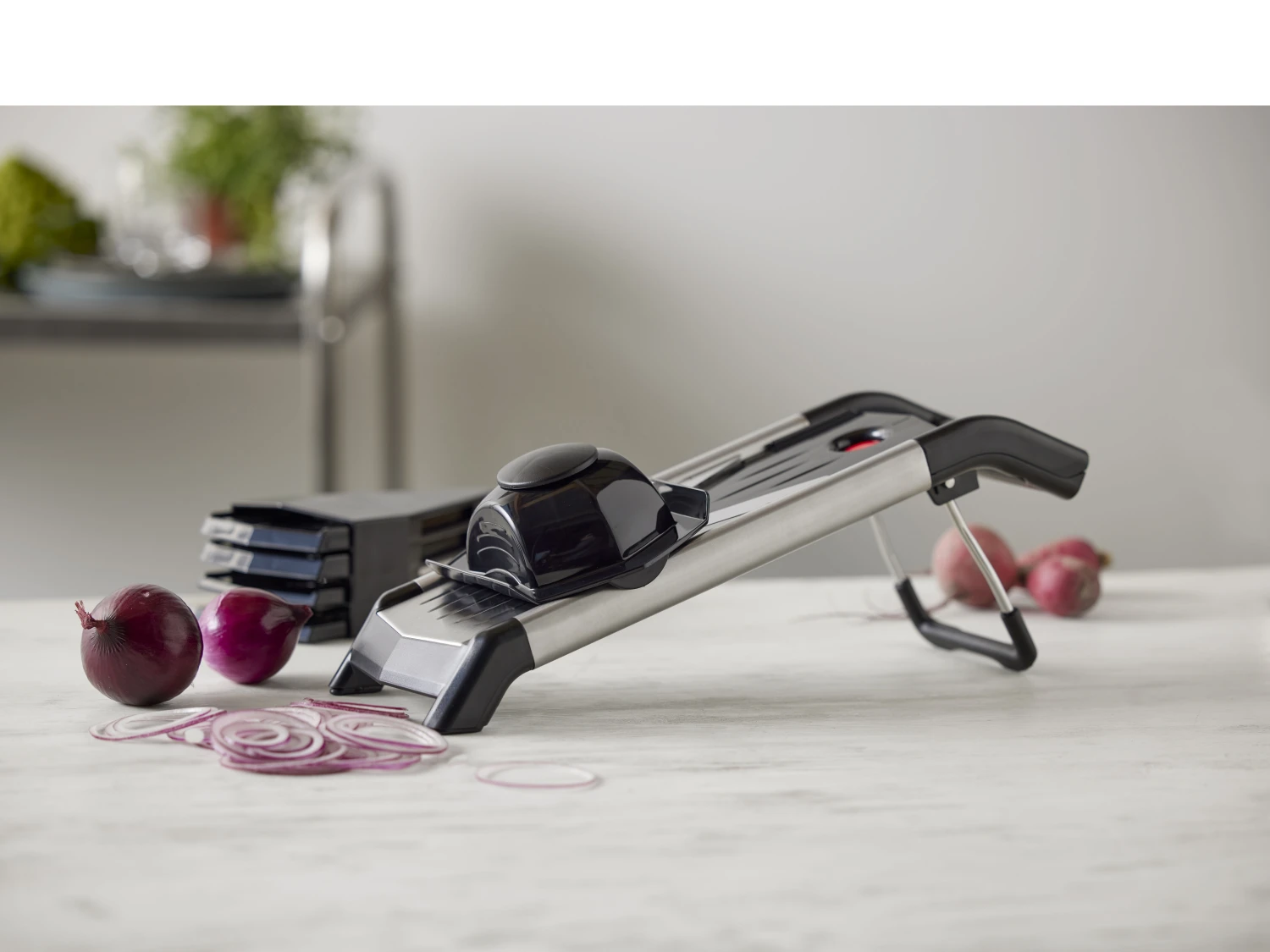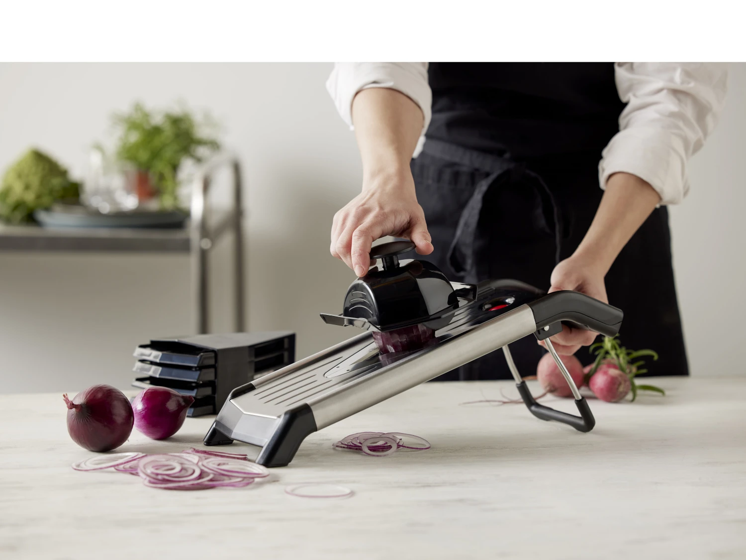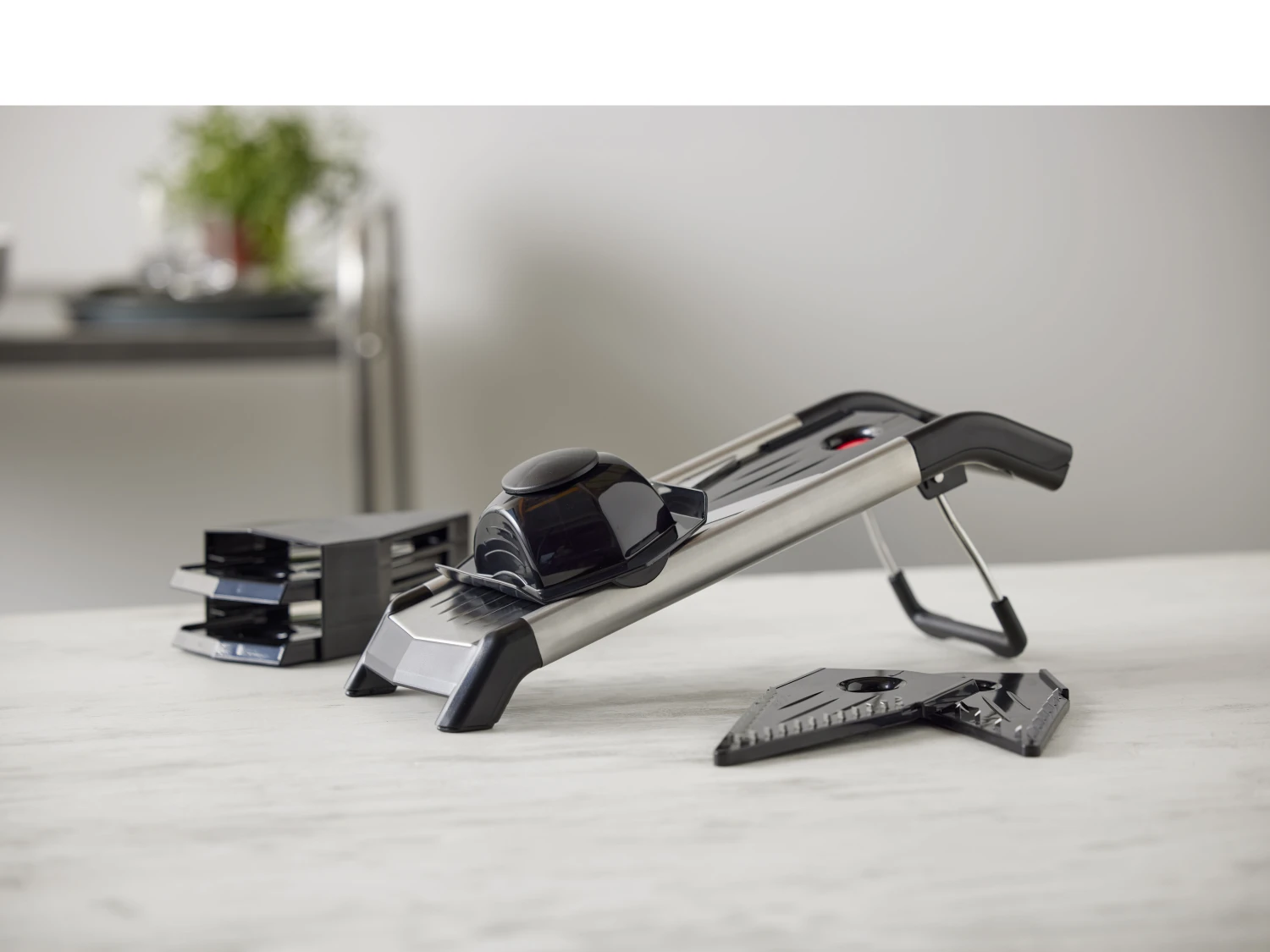 Leicht einzustellen, für dicke oder dünne Scheiben mit 1,5 mm, 2,5 mm und 3,5 mm. Im Lieferumfang sind auch Julienne-Einsätze enthalten, die Streifen mit 3,5 mm und 7 mm schneiden.
