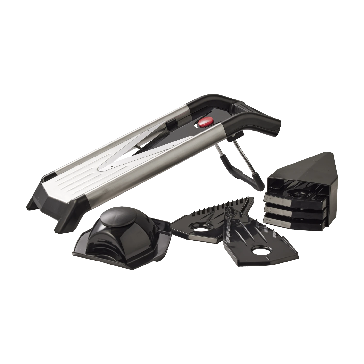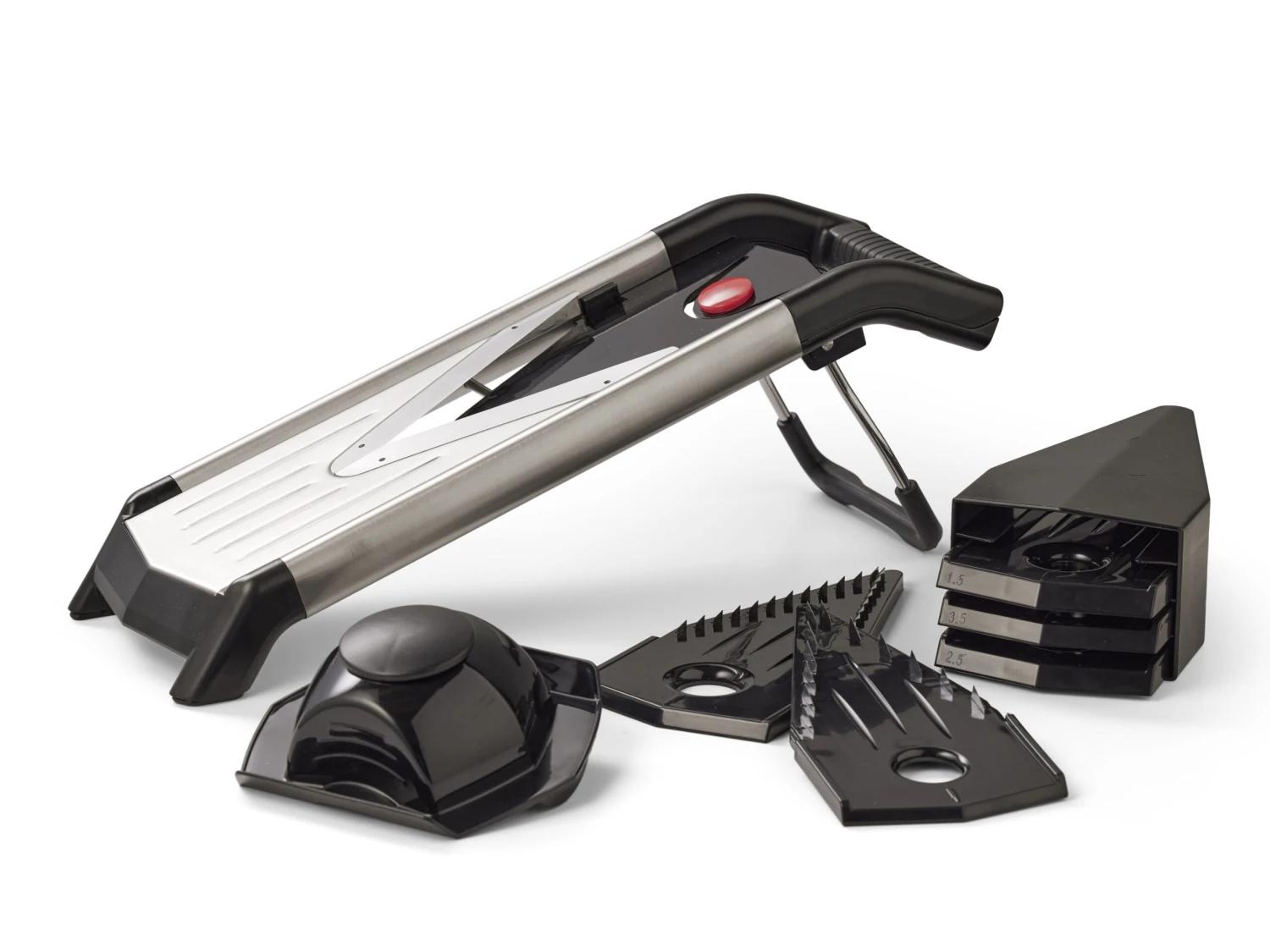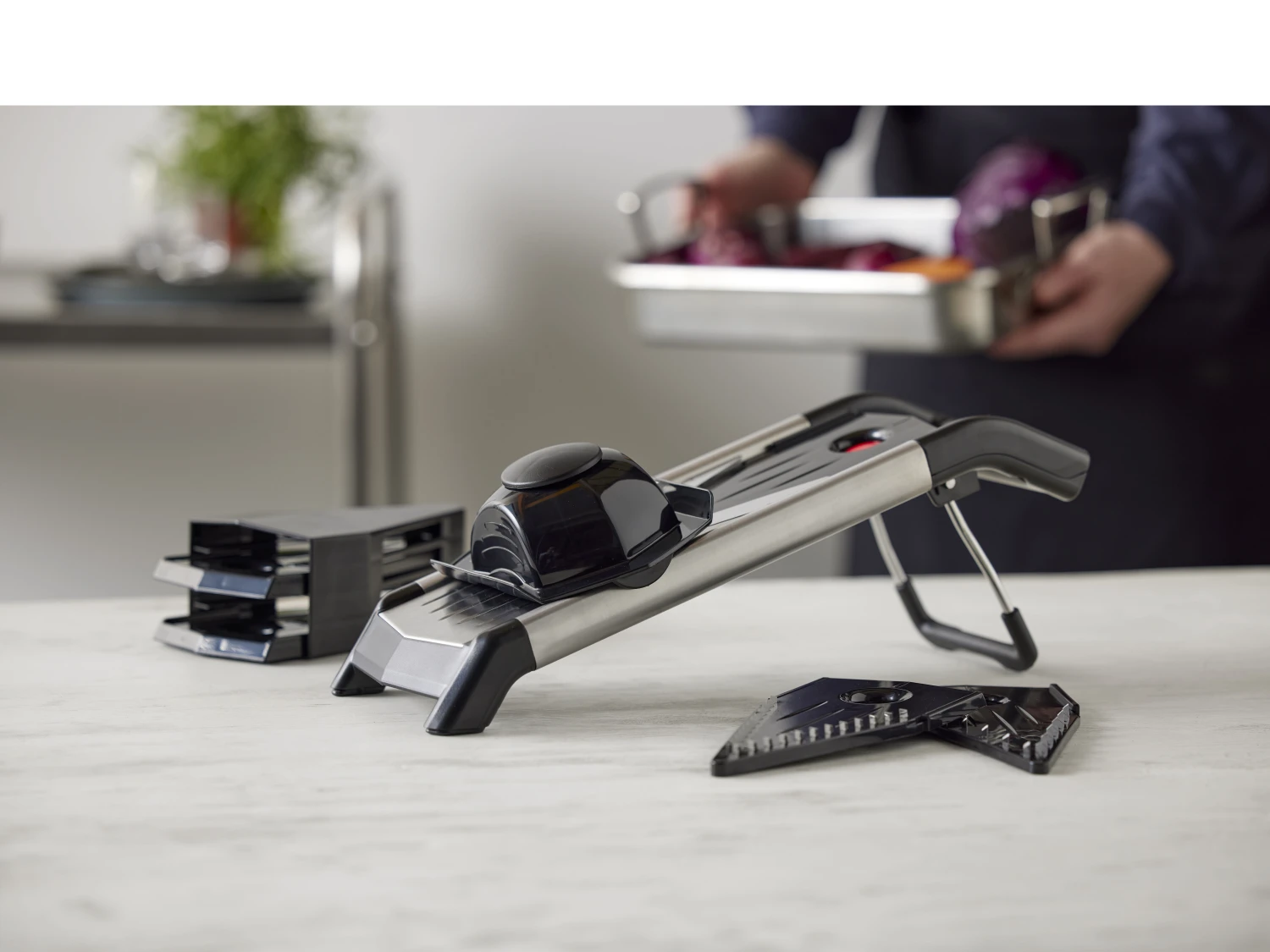 Leicht einzustellen, für dicke oder dünne Scheiben mit 1,5 mm, 2,5 mm und 3,5 mm. Im Lieferumfang sind auch Julienne-Einsätze enthalten, die Streifen mit 3,5 mm und 7 mm schneiden.