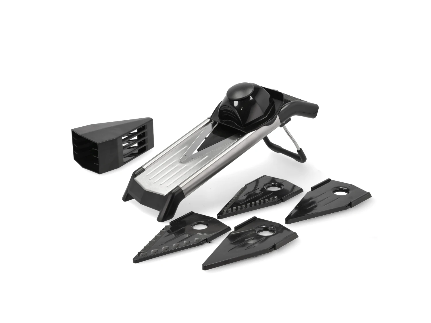 Mandolin-Eisen aus Edelstahl. Enthält 5 verschiedene Einsätze zum Reiben, Schneiden und Zerkleinern aller Arten von Gemüse, Obst oder Hartkäse. Das Mandolin-Eisen verfügt über Griffe und rutschfeste Füße, die für eine gute Stabilität während der Benutzung sorgen. Alle Teile sind für die Geschirrspülmaschine geeignet.