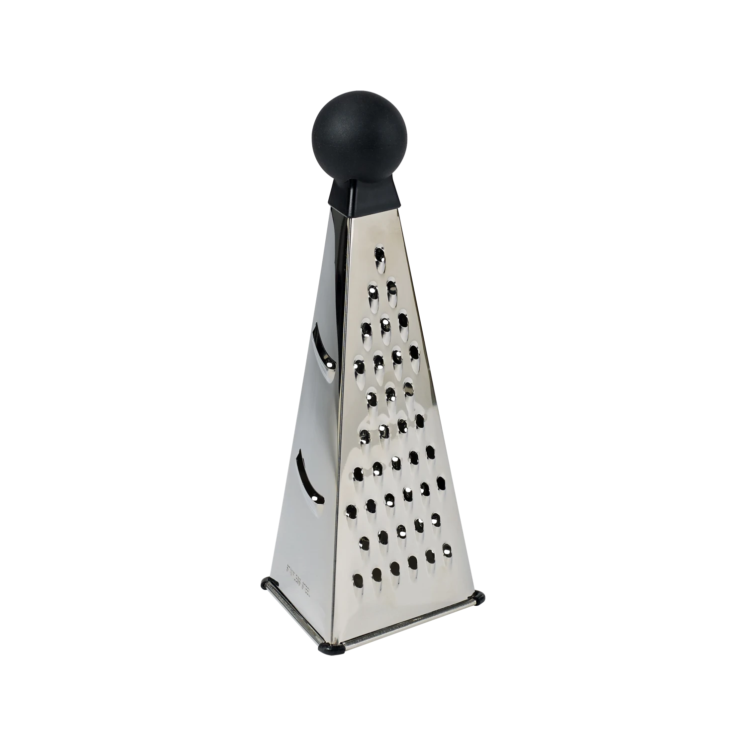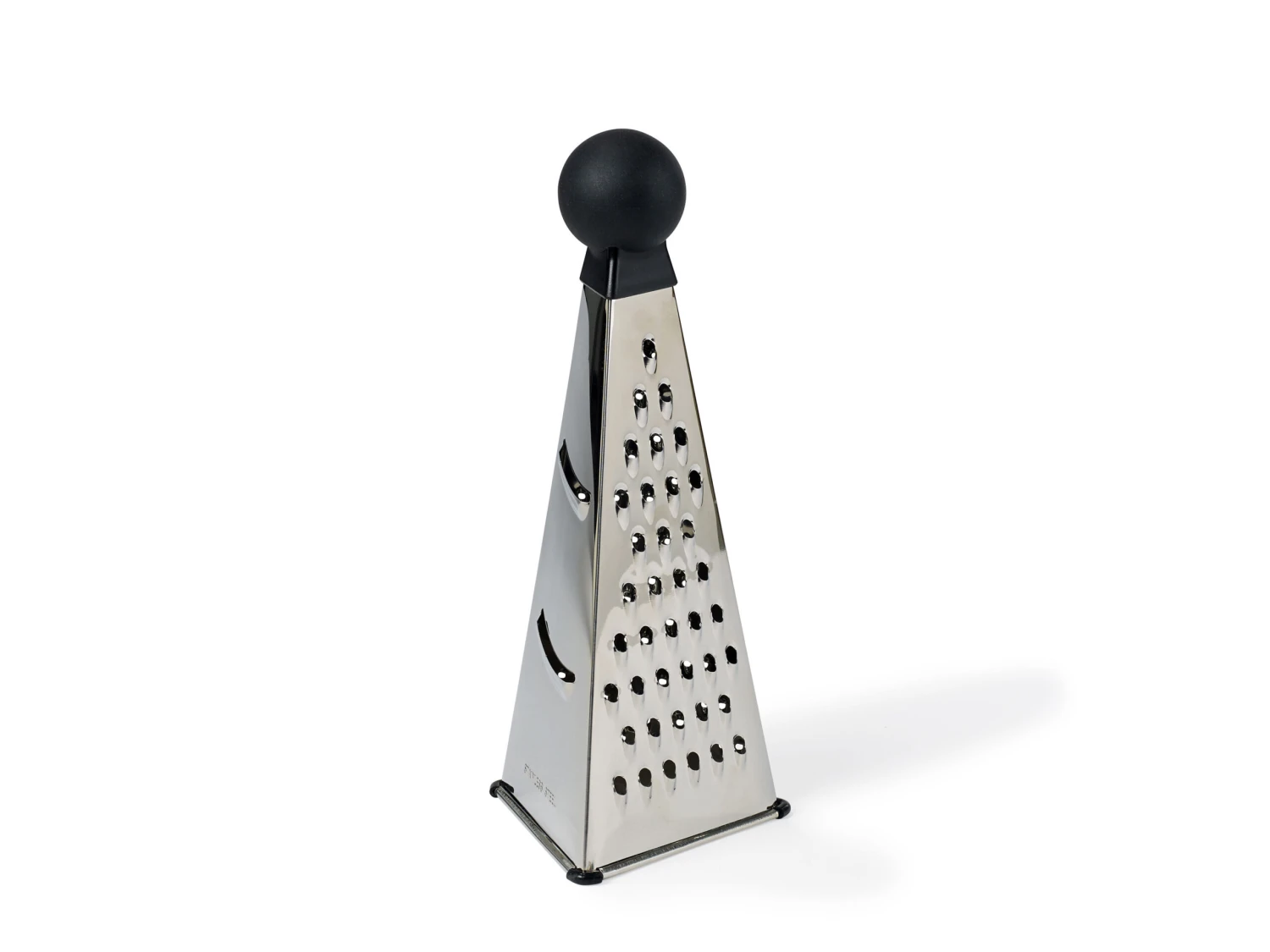 Reibeisen aus Stahl mit rundem Silikonoberteil, 25 cm hoch, zum Reiben und Zerkleinern von z. B. Parmesan, Gemüse und Wurzelgemüse. Die Reibe hat drei Seiten, von denen zwei jeweils fein und grob reiben, während die letzte Seite Scheiben in zwei Breiten mit einer Dicke von etwa 2 mm schneidet. Einfache Reinigung in der Spülmaschine.