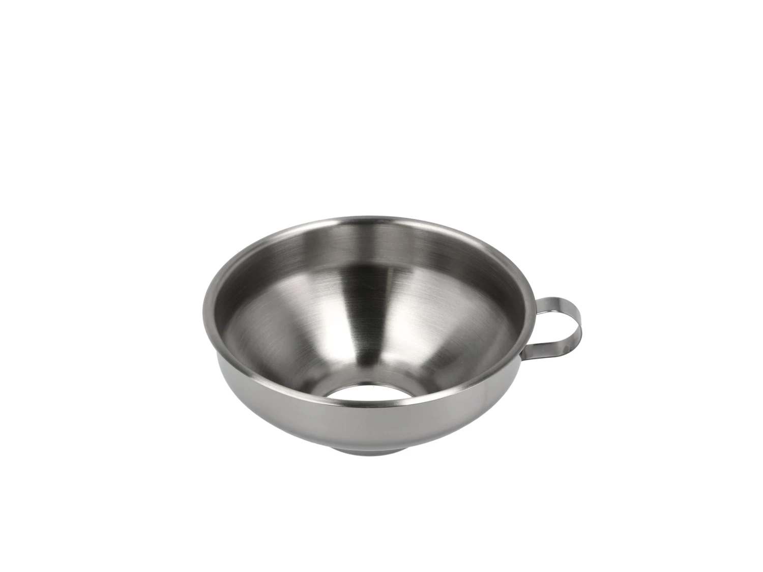 Praktischer Trichter mit Henkel aus Edelstahl. Die obere Öffnung des Trichters hat einen Durchmesser von 15 cm und die untere Öffnung hat einen Durchmesser von 5,3 cm. Die breite Öffnung unten macht den Trichter ideal zum Abfüllen von Marmelade, Gelee oder Püree in Gläser. Für den Geschirrspüler geeignet.