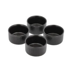 4 HOLM Ramekinformen aus schwarz glasiertem Steinzeug. Durchmesser 7 cm, Höhe 3,5 cm. Die Ramkinformen eignen sich für Soufflé, Gratin, Pastete, Marmelade, Tapenade und das Servieren in Portionen.