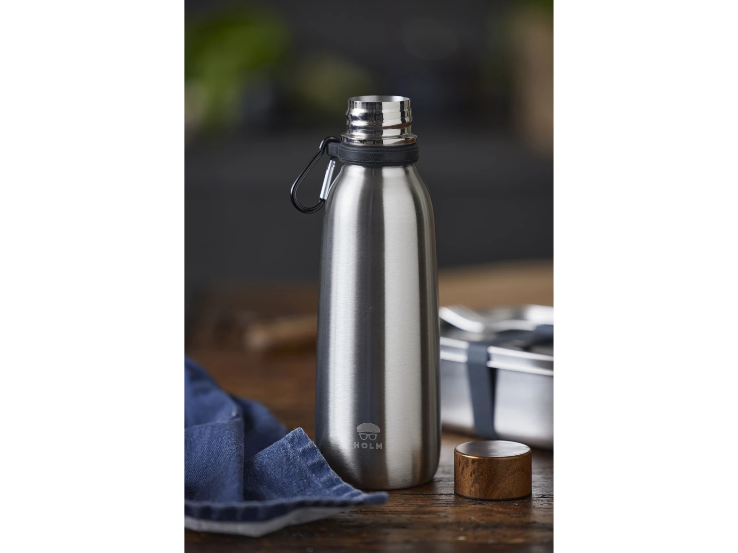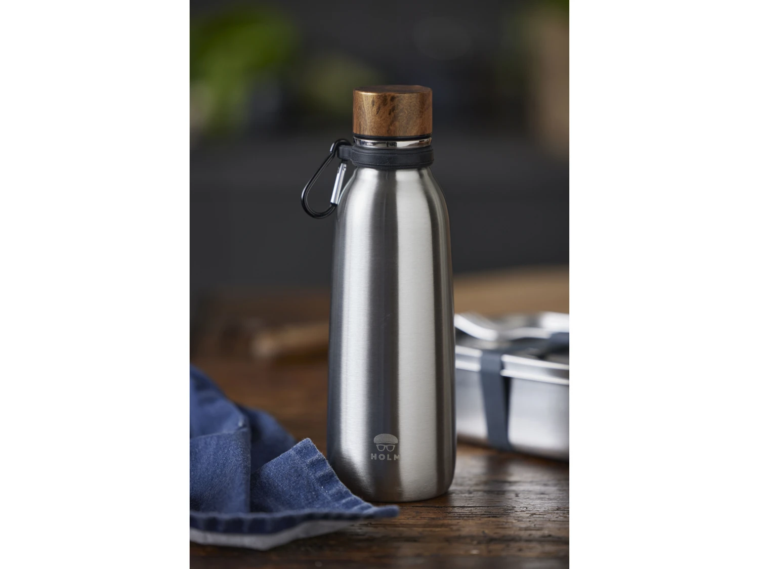 Die wunderhübsche Trinkflasche aus Edelstahl mit Satin-Finish hat einen Deckel in Holzoptik und einen Karabiner, sodass die Flasche auch außen am Rucksack befestigt werden kann, ohne Platz im Inneren oder in den Seitentaschen einzunehmen. Die Flasche fasst 700 ml und kann in der Spülmaschine gewaschen werden.