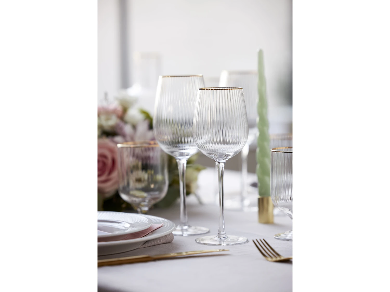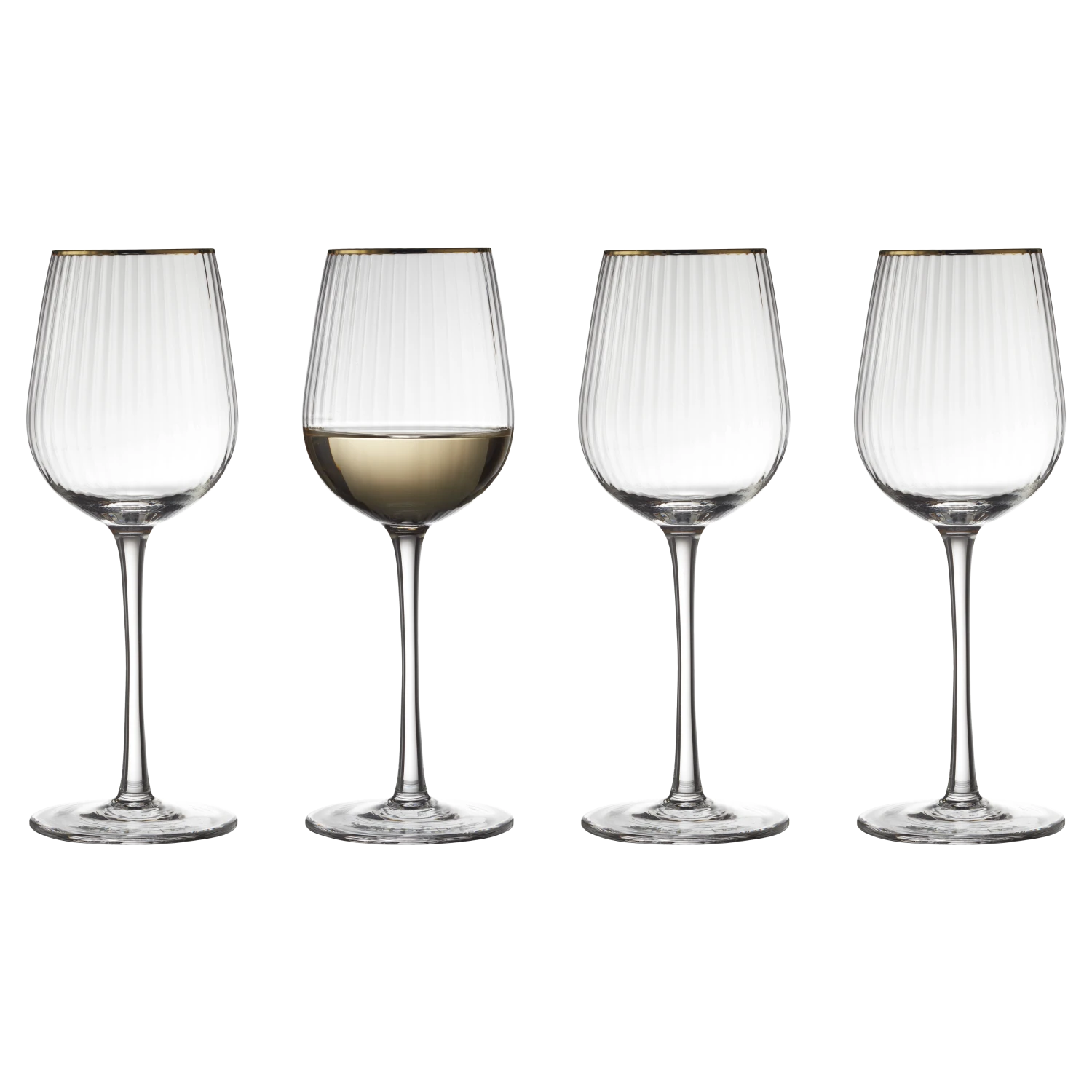 Hübsches Weinglas mit weichen, abgerundeten Formen. Das elegante, geriffelte Design mit hübscher Goldkante verleiht dem Glas einen tollen Vintage-Look, der gleichzeitig die Trends der Zeit widerspiegelt. Servieren Sie Ihren besten Wein in den Gläsern und die hübschen Facetten reflektieren das Licht und den Inhalt der Gläser auf wunderschöne Art und Weise.