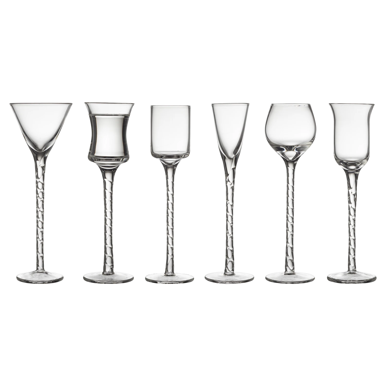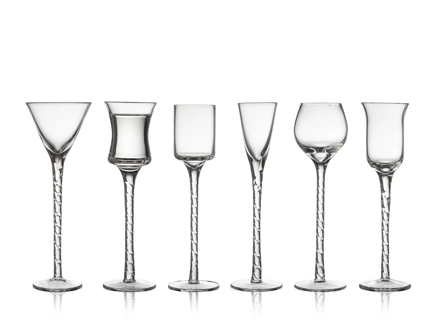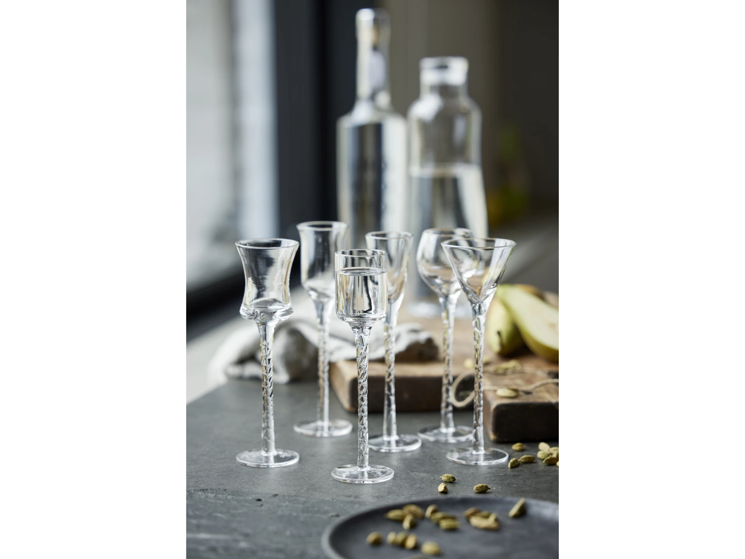 6 verschiedene mundgeblasene Schnapsgläser mit gedrehtem Stiel tragen zu einer guten Stimmung am Tisch bei, und es ist leicht, das eigene Glas wiederzufinden. Die Schnapsgläser aus klarem Glas sind unterschiedlich geformt und können zwischen 2,5 und 5 cl enthalten. H 18 cm.