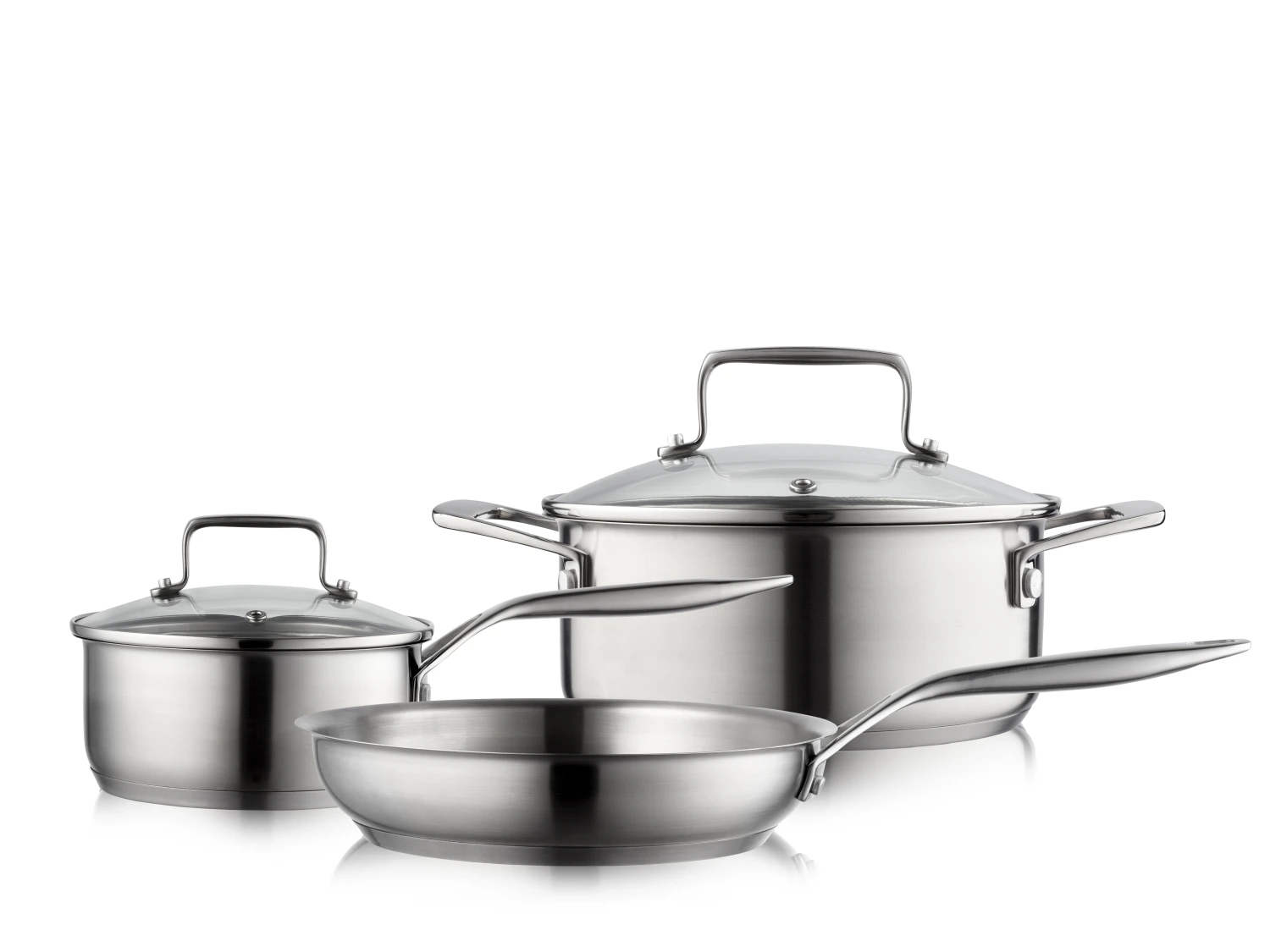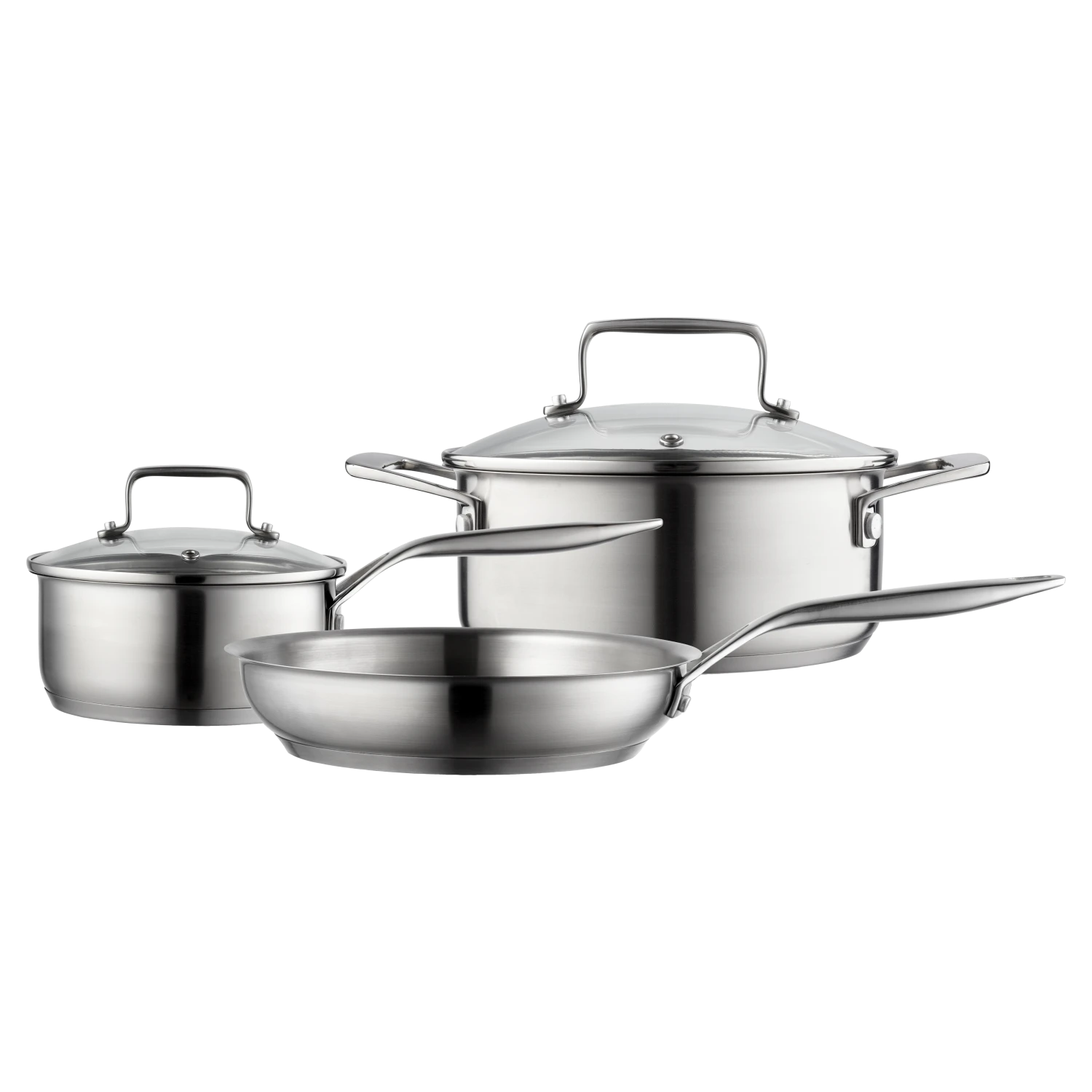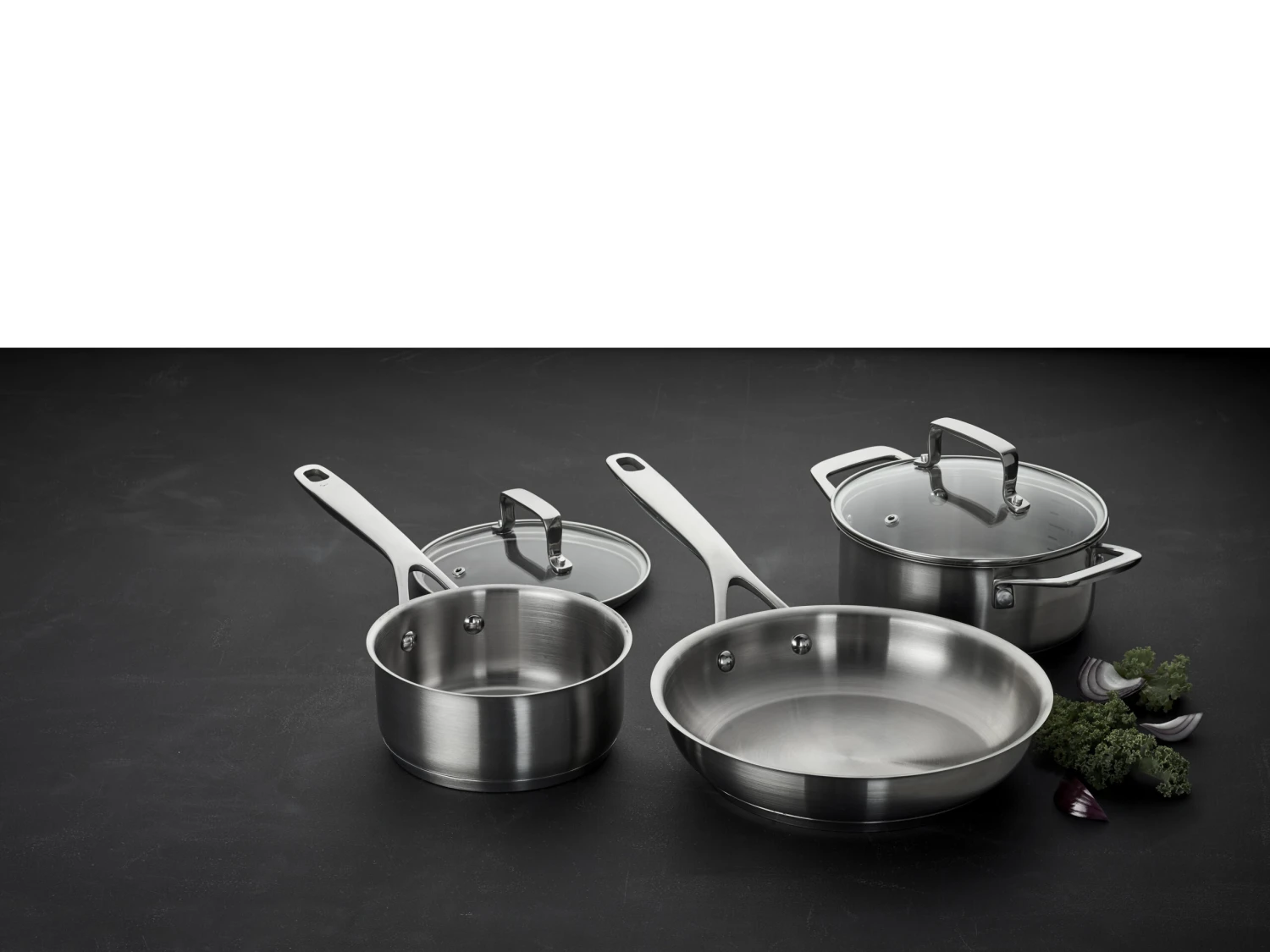 Pfanne-/Topf-Set, 5 Teile. Dieses perfekte Starterset besteht aus einem 1,3 l Topf mit Deckel, Durchmesser 16 cm, einem 1,7 l Topf mit Deckel, Durchmesser 18 cm und einer 24 cm Bratpfanne. Die Serie 79NORD ist aus 18/8 Edelstahl hergestellt und die Glasdeckel haben ein Dampfloch.