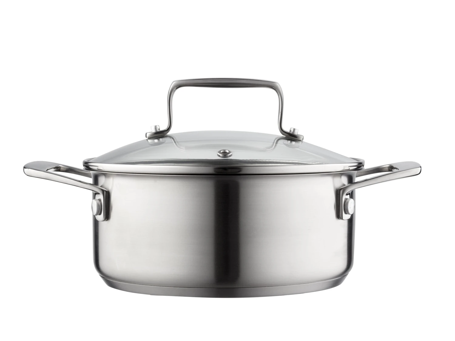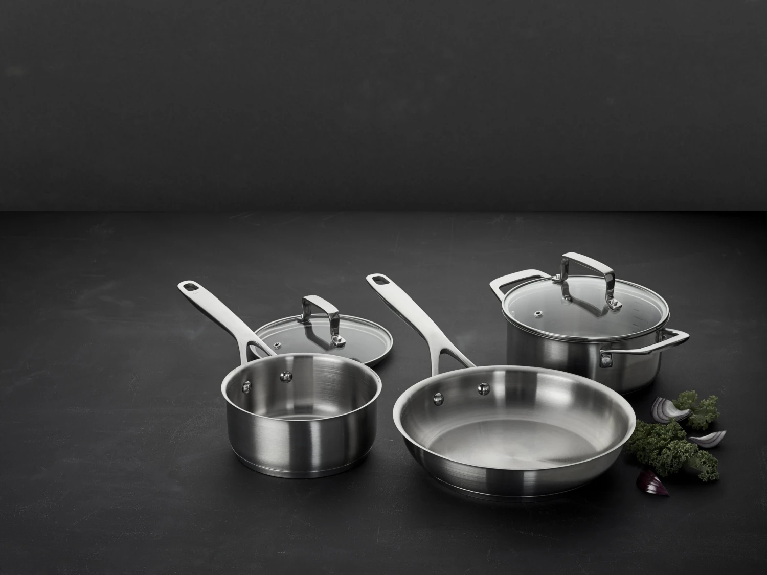 Am Boden der Pfanne und der Töpfe sitzt ein Aluminiumkern mit Edelstahl auf beiden Seiten, auch Sandwich-Boden genannt, wo die äußere Schicht magnetisch ist. Die Wärme wird gleichmäßig und energieeffizient über den Boden und die Seiten verteilt und gehalten, und gleichzeitig ist das Material leicht. Es ist außerdem sehr hygienisch und leicht zu reinigen. Die Produkte können auf allen Wärmequellen verwendet werden – von traditionellen Kochplatten über Glaskeramik und Induktionskochfelder bis hin zu Elektro- und Gasherden. Geeignet für die Spülmaschine.