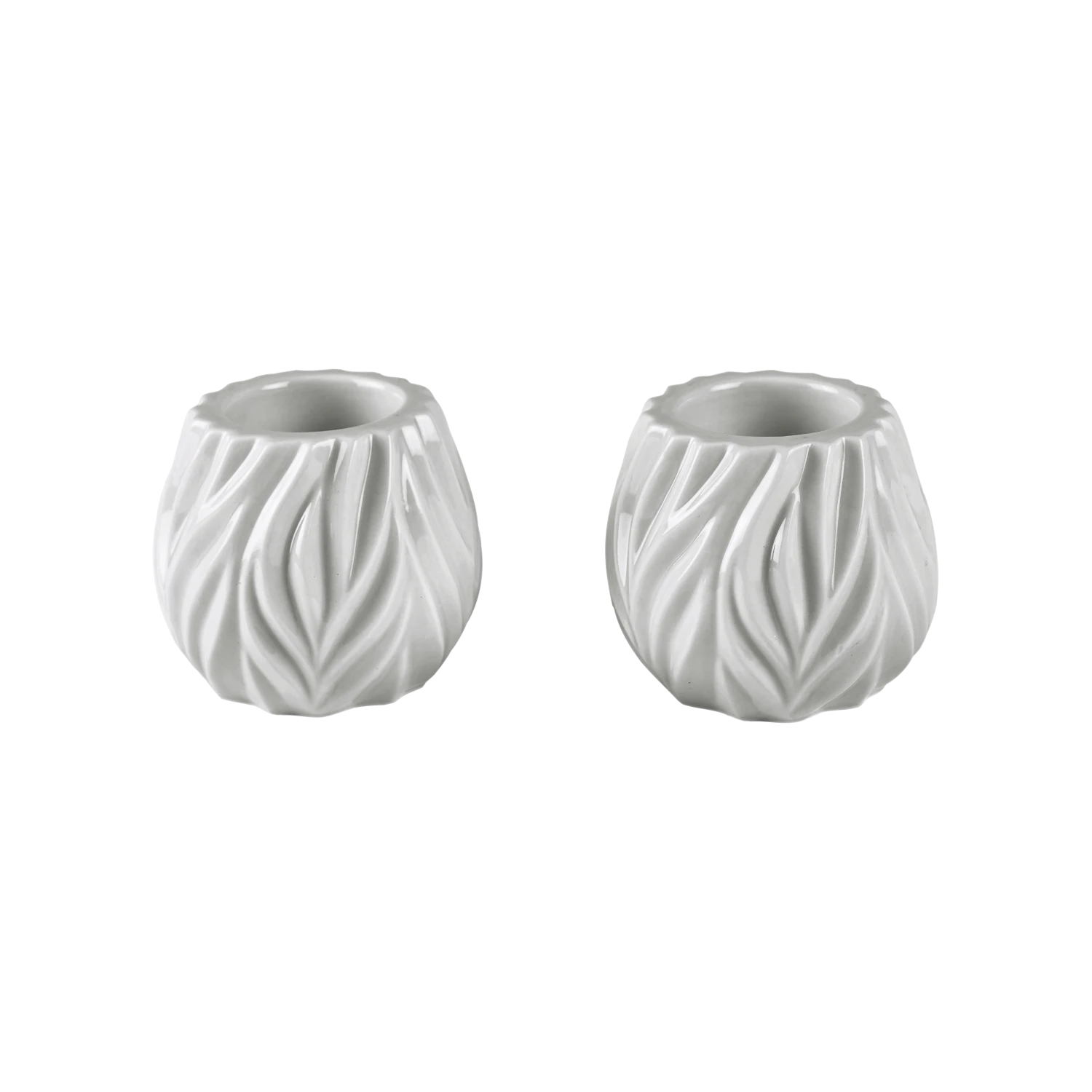 Die Inspiration für das Design stammt vom Spiel der Flammen im Feuer, was besonders durch die weiße Glasur betont wird, die im Zusammenspiel mit Form und Vertiefungen im Muster zwischen warmen Nuancen und kühleren Tönen wechselt – genau wie bei Feuer. Ihre schöne, skulpturale Form und das fantastische Spiel der Farben macht die Teelichthalter einzigartig und dekorativ.