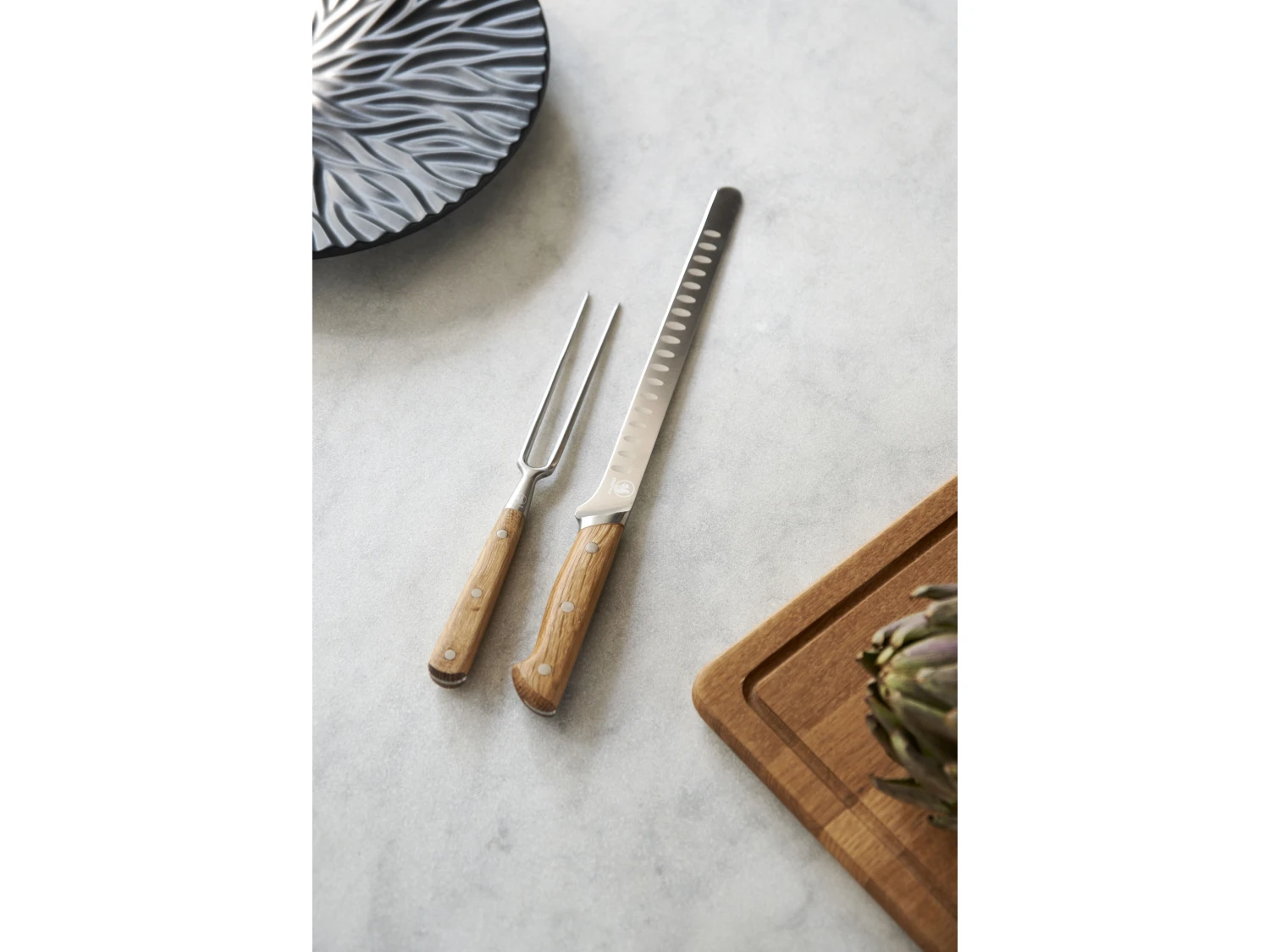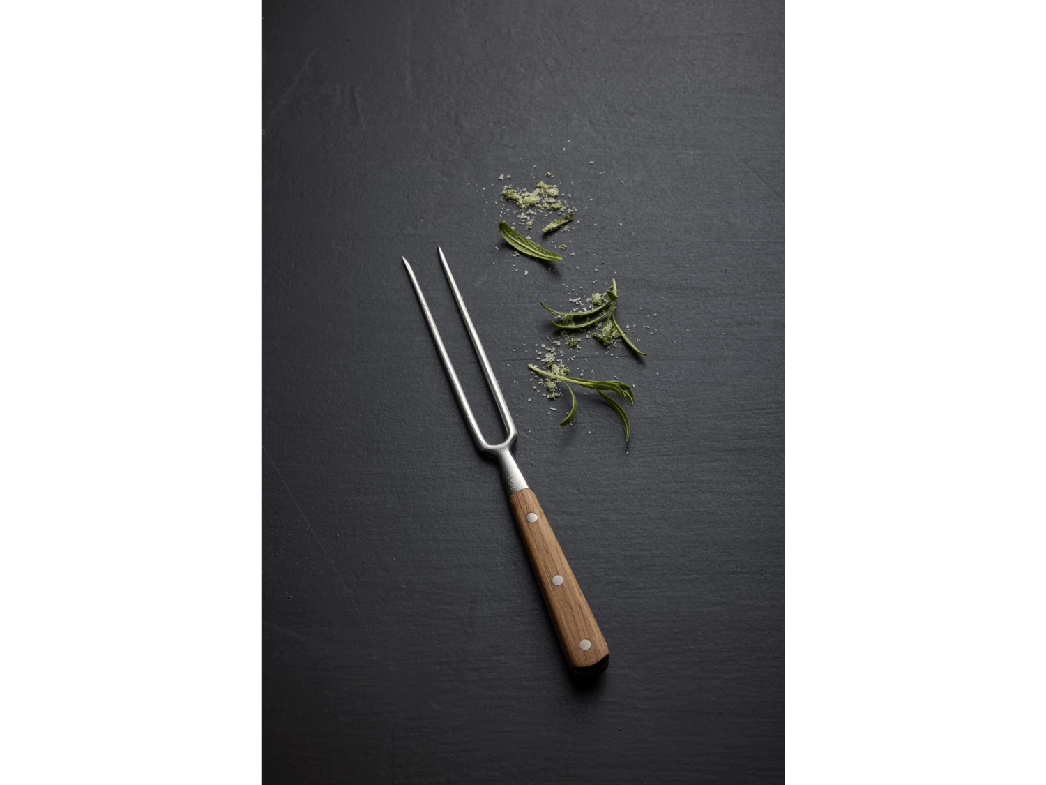 Die schöne und nützliche Bratgabel eignet sich, um Fleisch, Geflügel usw. während des Schneidens an Ort und Stelle zu halten. Die Messerklinge besteht aus hochwertigem Edelstahl und der Griff aus geölter Eiche, die bei Gebrauch Patina entwickelt und einfach schöner wird, je öfter die Bratgabel verwendet wird. Der Holzgriff liegt angenehm in der Hand.