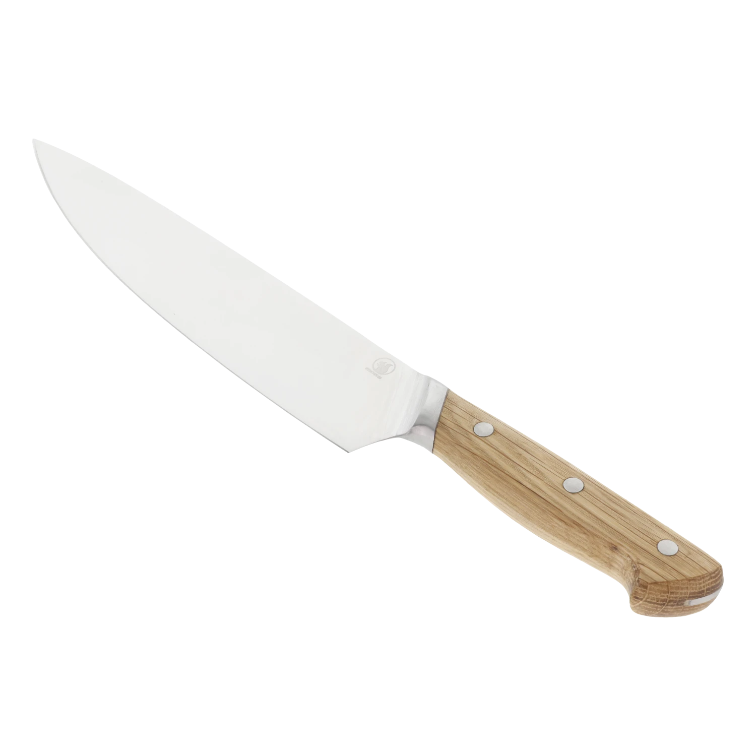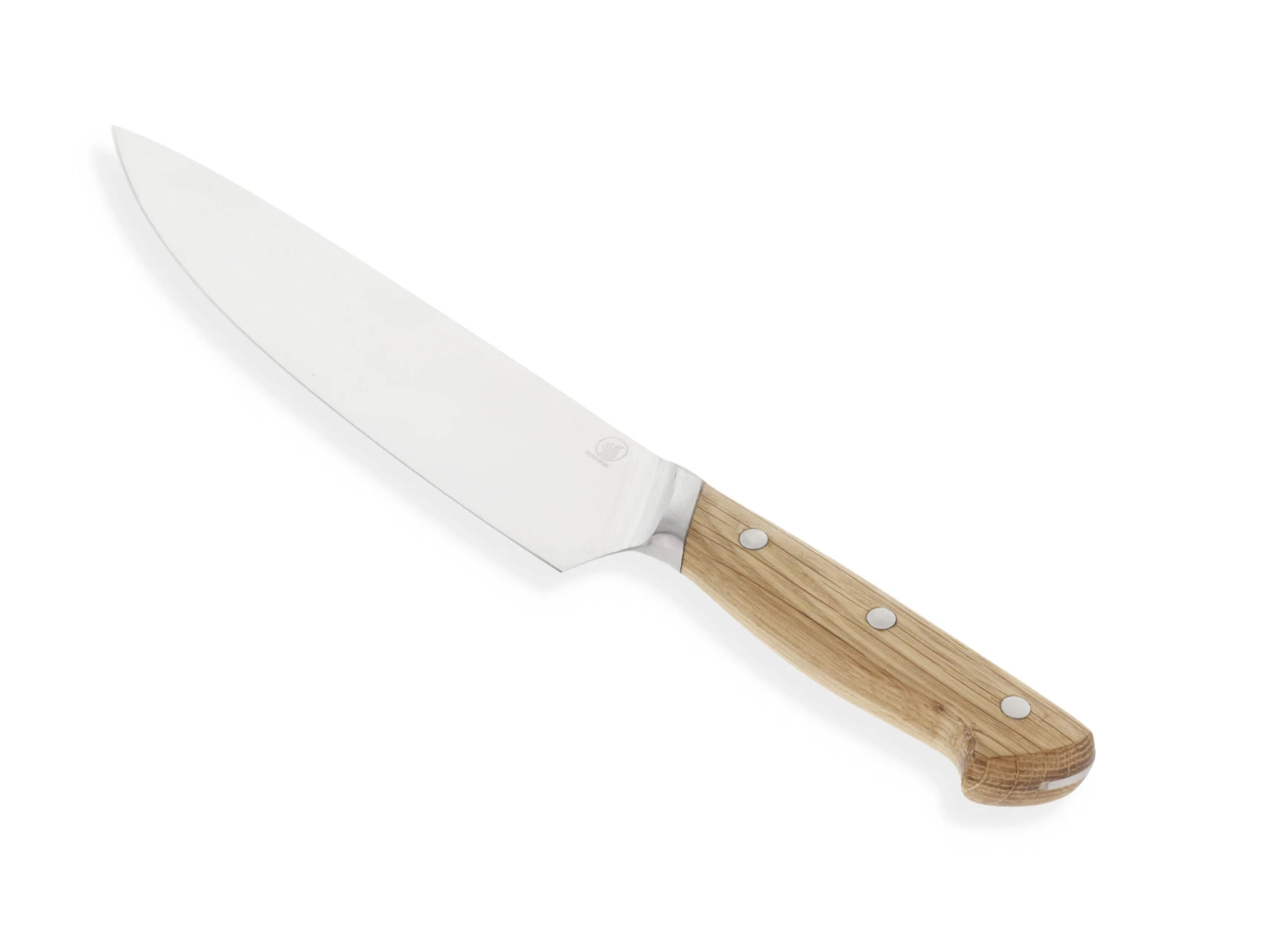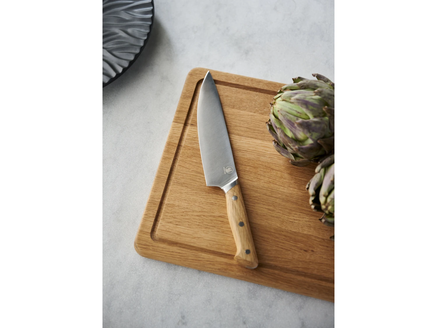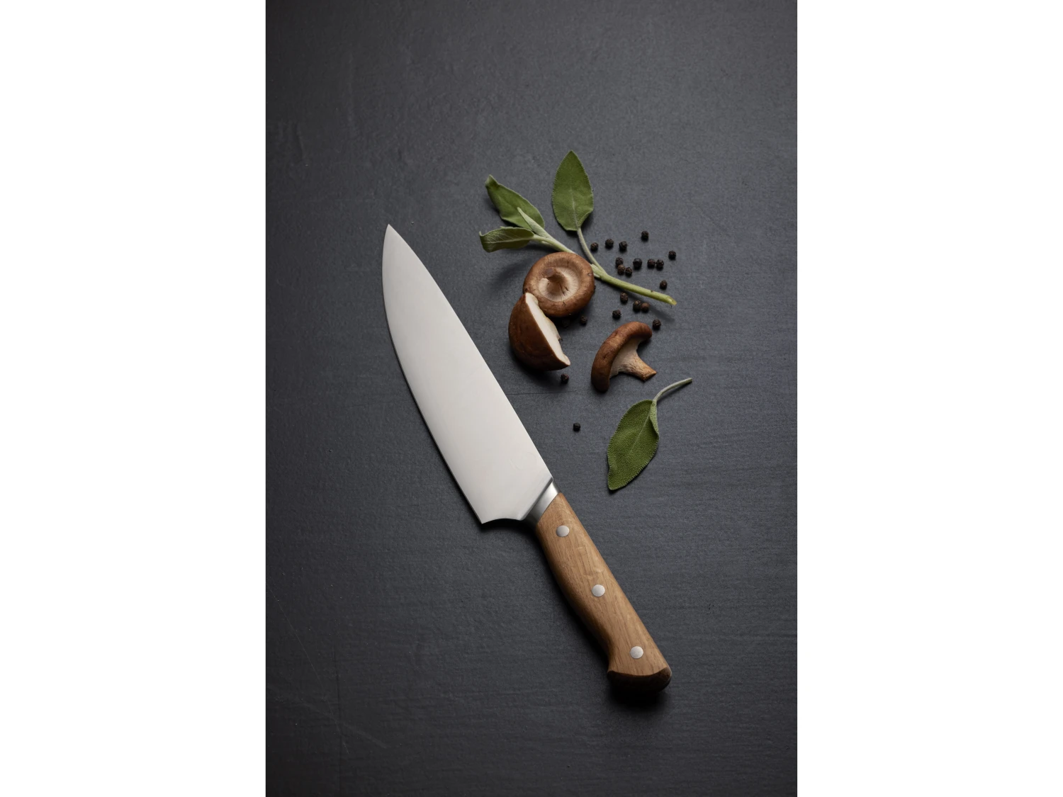 Die Messerklinge besteht aus hochwertigem Edelstahl und der Griff aus geölter Eiche, die bei Gebrauch Patina entwickelt und einfach schöner wird, je öfter das Messer verwendet wird. Der Holzgriff ist aus einem Stück Holz gefertigt und liegt angenehm in der Hand.