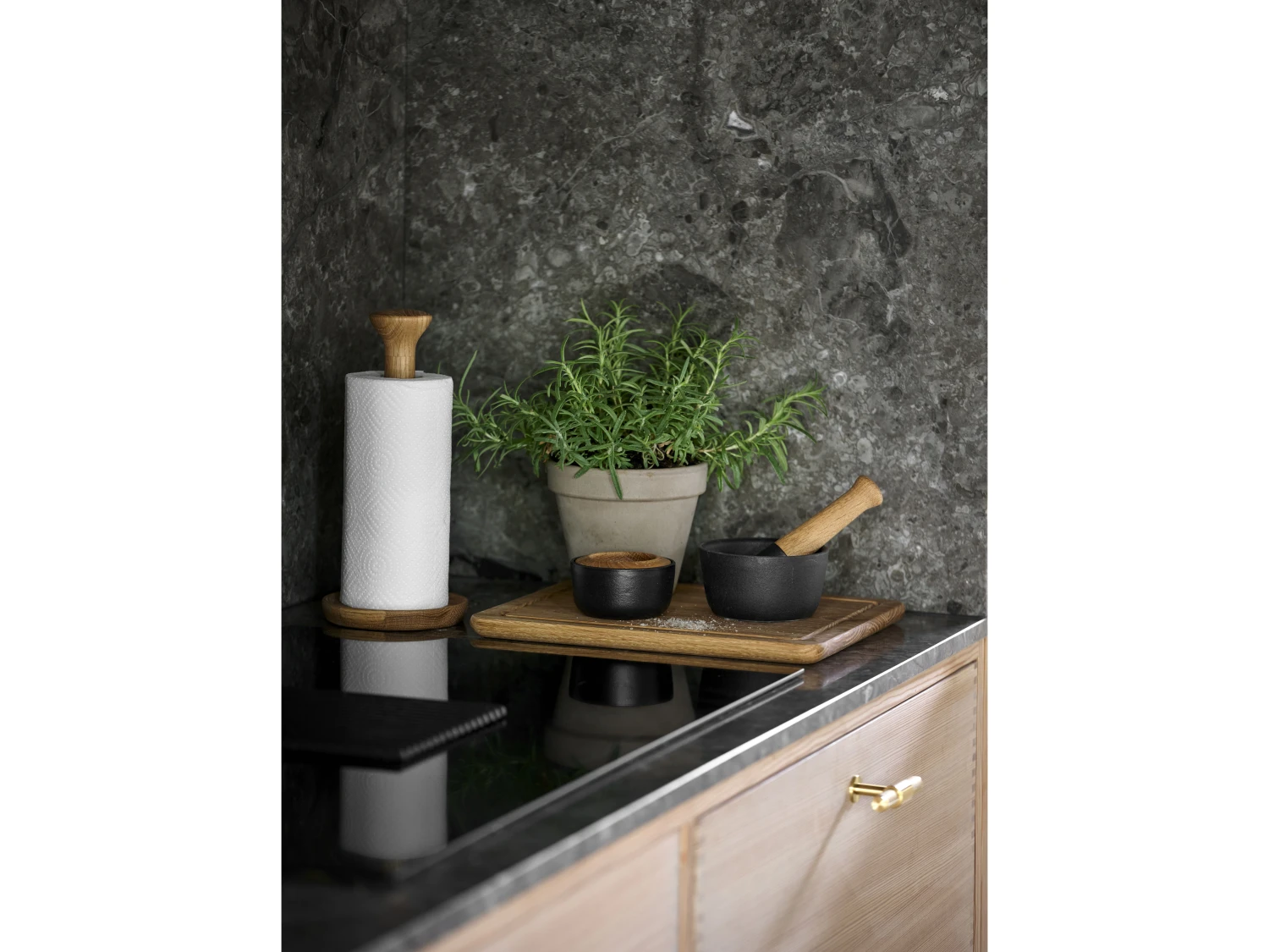 Rustikaler und solider Küchenrollenhalter mit Fuß und Halter aus gedrechselter, geölter Eiche. Ein funktioneller Magnet macht es einfach und schnell, die Küchenrolle auszutauschen. 30 cm x 14 cm im Durchmesser.