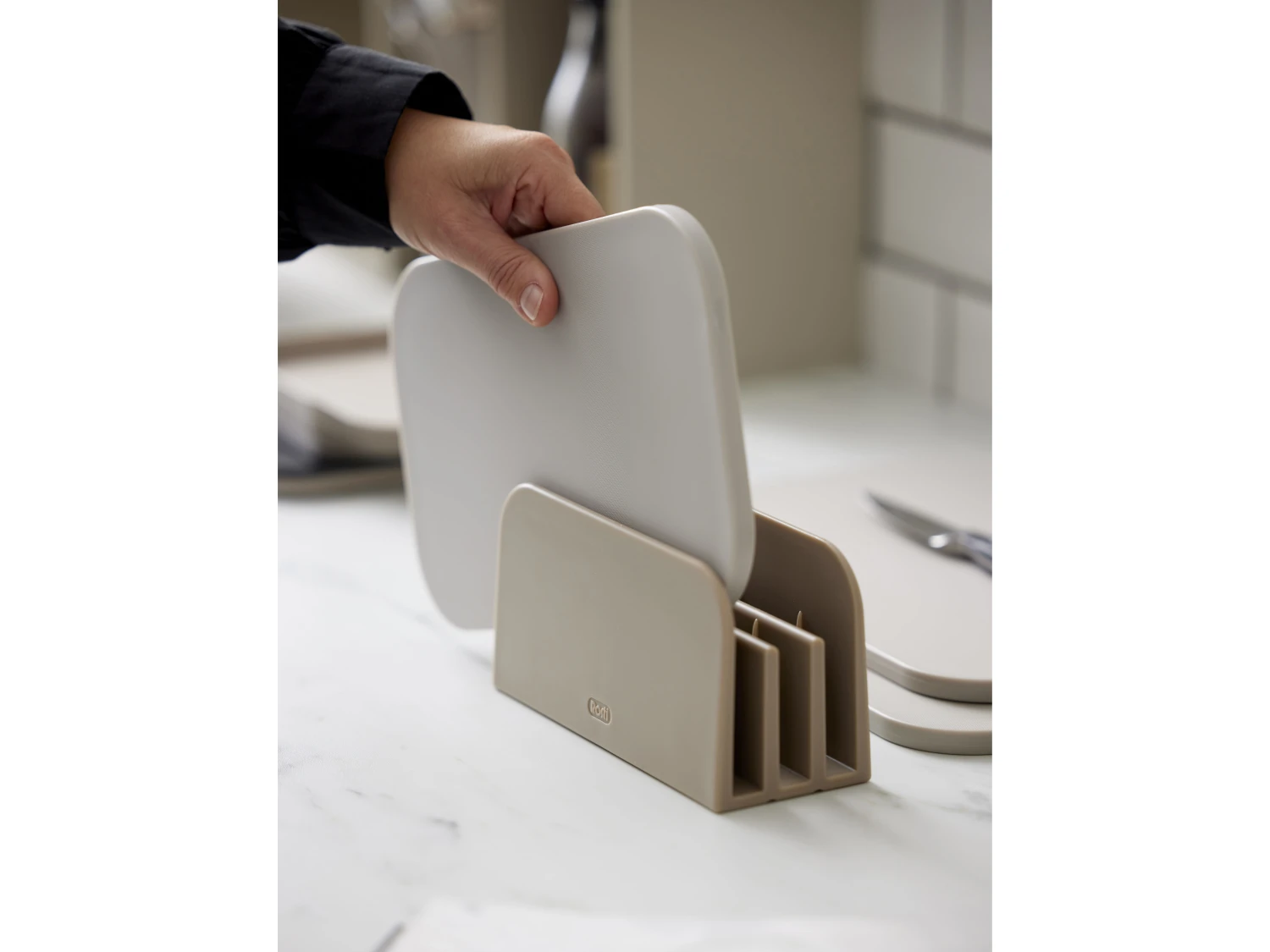 Choptima ist eine Serie von funktionalen Qualitätsschneidebrettern im dänischen Design. Der smarte Halter für die Schneidebretter dient zur Aufbewahrung und sorgt für bessere Hygiene. Er hält die Schneidebretter zusammen, ohne viel Platz auf dem Küchentisch einzunehmen, und ist so konzipiert, dass Sie ein feuchtes Schneidebrett direkt in die Halterung stellen können. Die Schneidebretter stehen nämlich mit etwas Abstand zueinander, und an der Unterseite der Halterung befinden sich Rillen, die für eine gute Belüftung und damit für Hygiene sorgen, z. B. wenn das Brett beim Hineinstellen noch feucht ist. Alle Teile sind für die Geschirrspülmaschine geeignet.