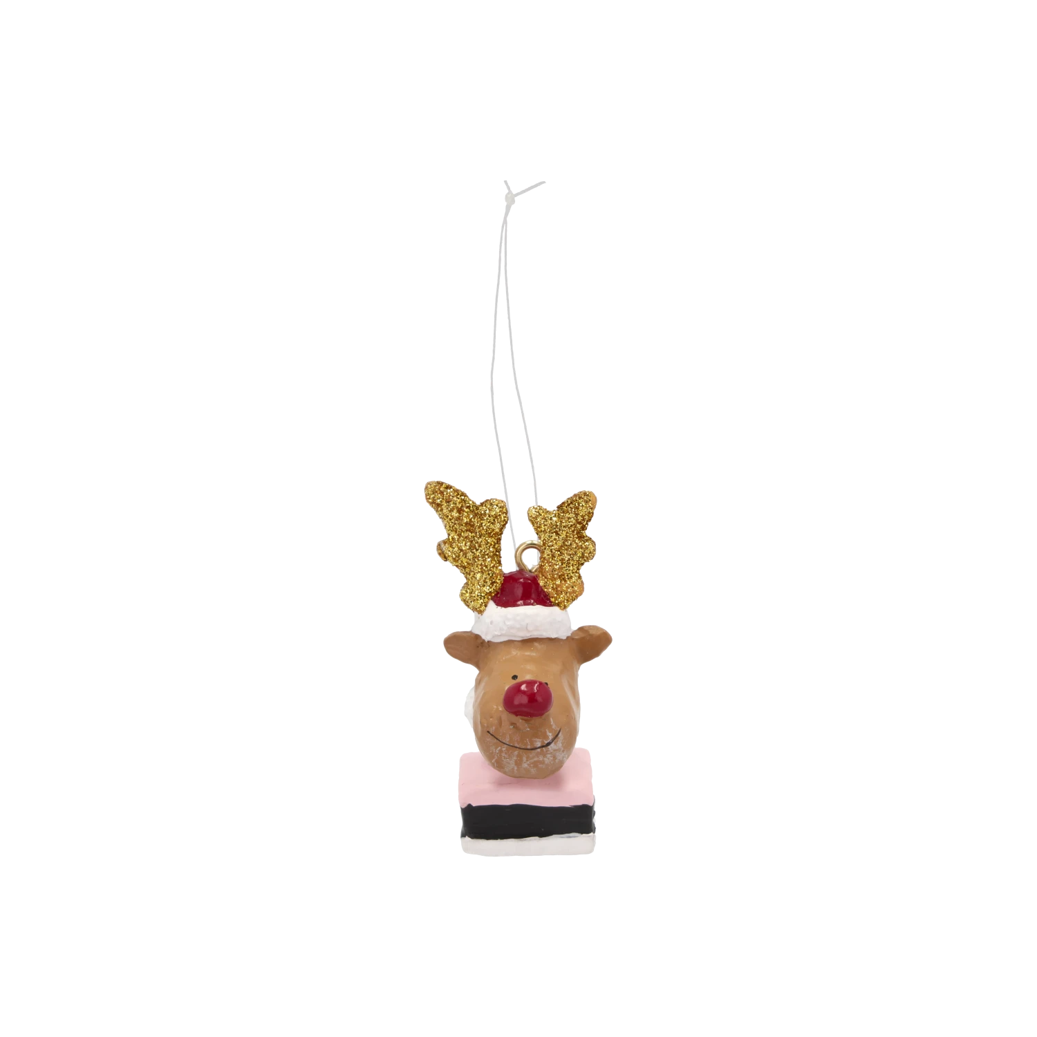 Rudolf hat die Mütze des Weihnachtsmanns aufgesetzt und lugt aus einem köstlichen Stück Lakritz-Konfekt hervor. Er verbreitet jede Menge Freude und gute Laune, wenn er an einem Zweig des Weihnachtsbaums hängt, umgeben von Elfen, Engeln und anderen originellen Weihnachtsdekorationen.