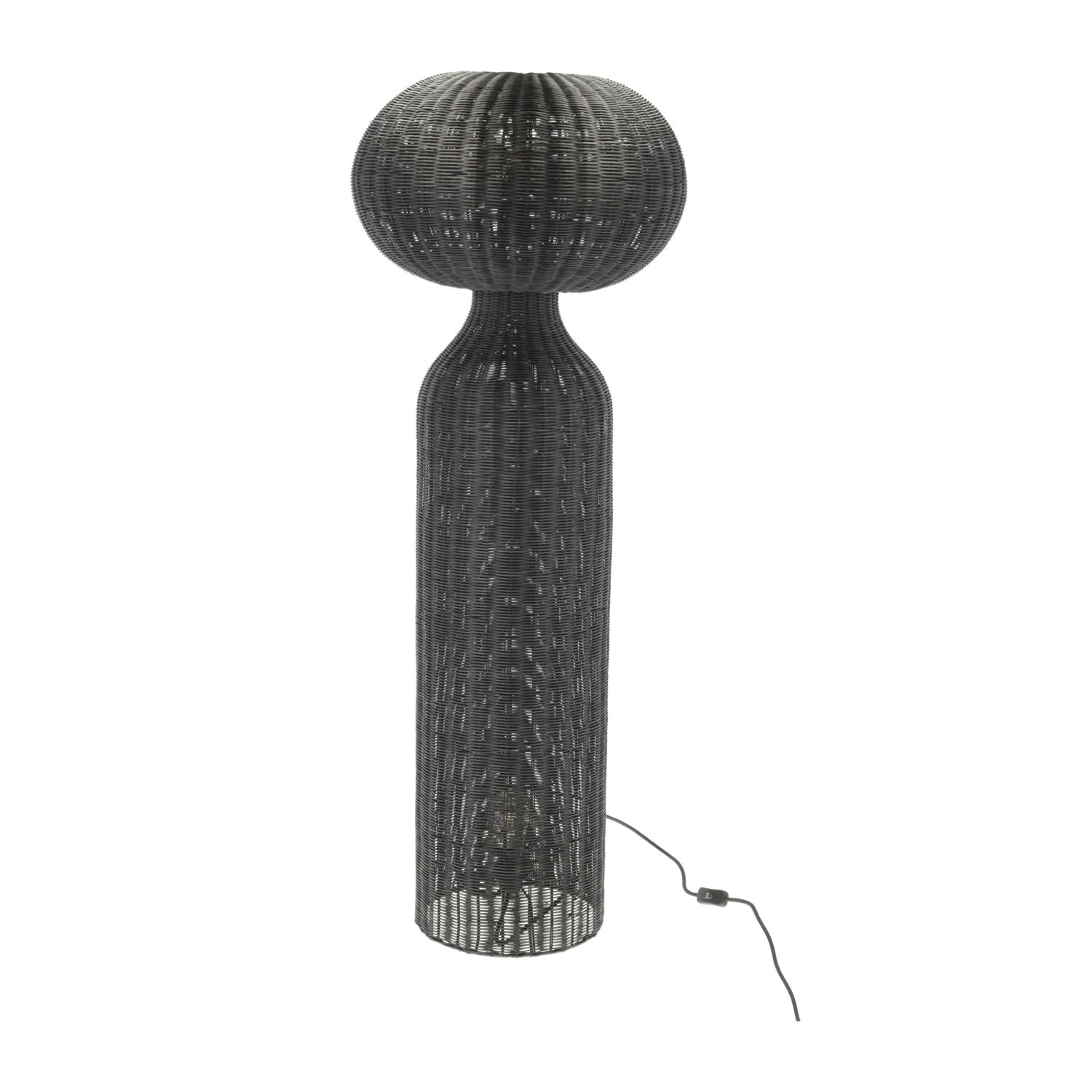 Stehleuchte aus schwarzem Rattan. mit weichem und elegantem Licht. Ein tolles und warm leuchtendes Detail, das in jede kühle skandinavische Einrichtung passt. Mit 3 m langem schwarzem Polyesterkabel und 2 x E27 Fassung. D 50 x H 130 cm.