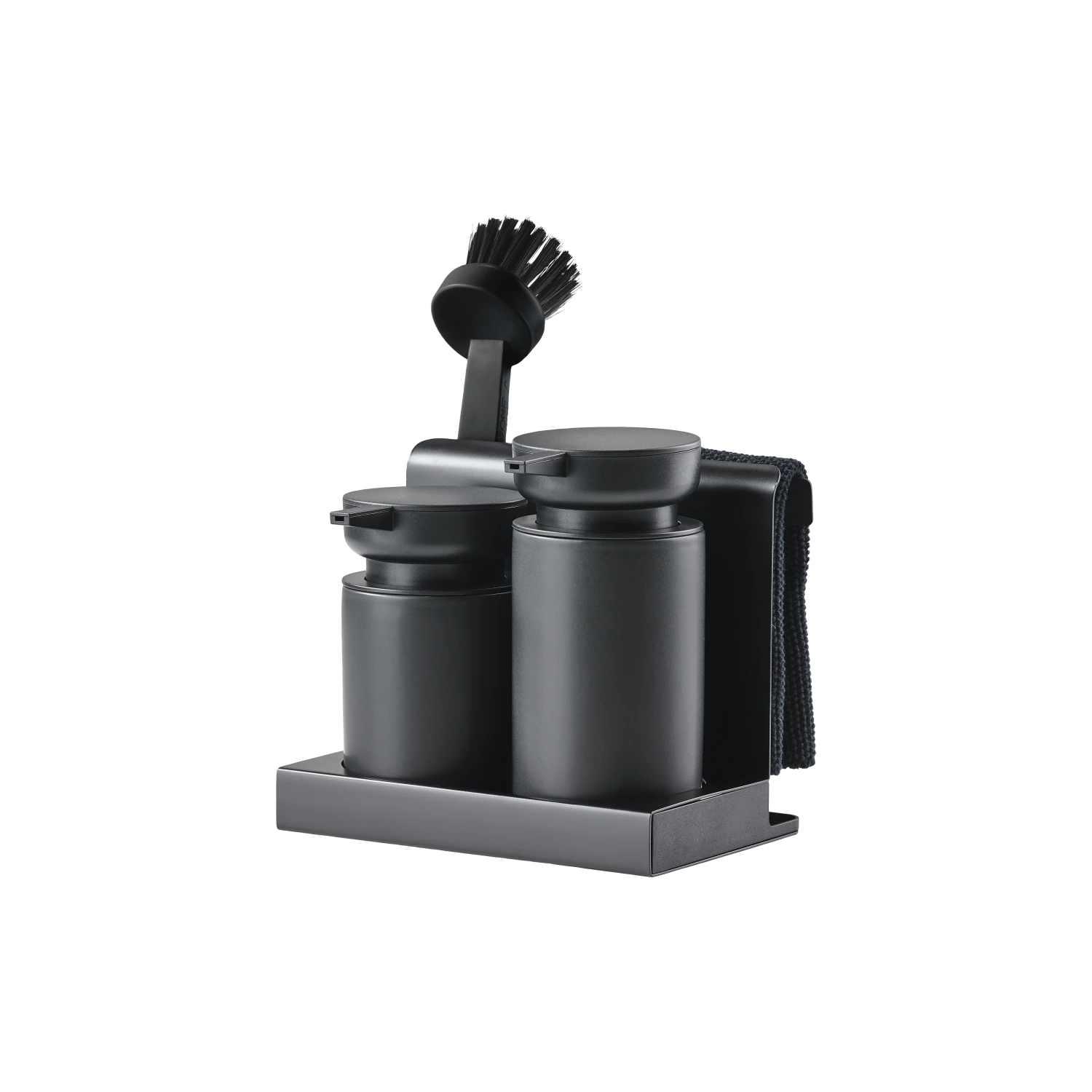 Vorn steht das Spenderduo mit Spülmittel und Handseife/ Desinfektionsmittel. Beide Teile sind aus Keramik. Dahinter hängt ganz unscheinbar das gestrickte Spültuch zum Trocknen, bis es benötigt wird. Gesellschaft erhält es von der Bürste in passender Farbe. Ein letztes praktisches Detail ist die kleine Bodenschale, die überschüssiges Wasser auffängt, damit es nicht auf dem Küchentisch landet.