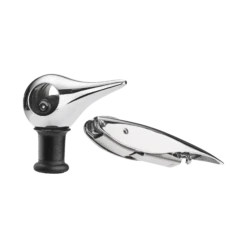 Das elegante Weinset von Zone besteht aus einem Bird Weinverschluss und einem Feather Korkenzieher. Feather ist eine tolle Interpretation eines Kellnerwerkzeugs, sozusagen ein Klassiker in neuen Kleidern. Feather hat einen eingebauten Folienschneider und einen Öffner, und der biegsame Arm macht es einfach, die Flasche in zwei Schritten zu öffnen, ohne viel Kraft aufwenden zu müssen. Kann leicht zusammengeklappt und z. B. zu einem Picknick mitgenommen werden. Das elegante figurative Design des Bird Weinverschlusses hat eine geniale Funktion. Setzen Sie den Verschluss auf die offene Weinflasche, wippen Sie den Schnabel des Vogels zur anderen Seite und Sie haben eine völlig dicht schließende Flasche. Die Flasche kann sogar im Kühlschrank liegen, bis Sie wieder Lust auf ein Glas Wein haben. Design: Mencke und Vagnby.