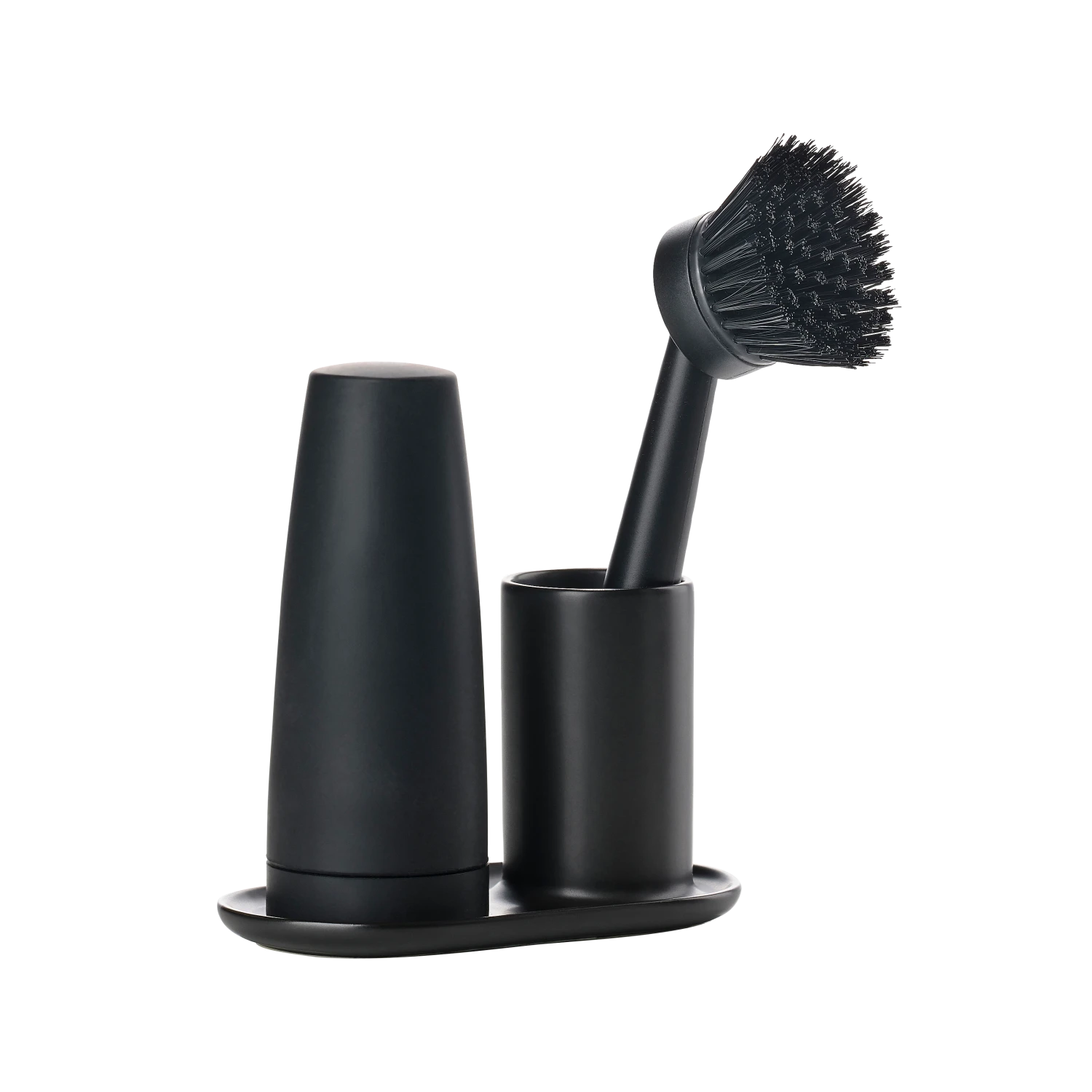 Einfaches, handliches und völlig diskretes Geschirrspülset von Singles. Der Keramikhalter kann in die Spülmaschine eingesetzt werden und Sie können den Bürstenkopf ersetzen. Der lose Spender gibt die Seife mit leichtem Druck ab und setzt sie dann wieder ein.