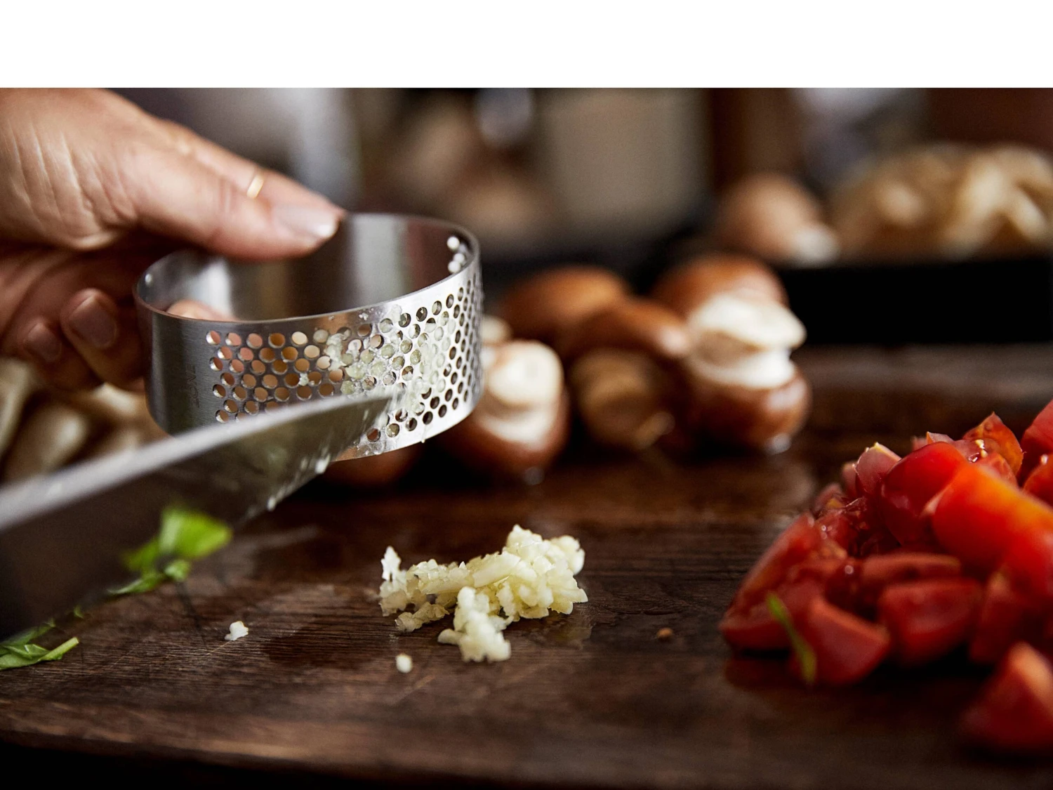 Verführerisch schlicht – so kurz kann man den Knoblauchpresser von Zone Denmark beschreiben. Form und Funktion gehen bei diesem formschönen und effektiven Werkzeug ganz ohne mechanische Teile Hand in Hand. Alles, was Sie tun müssen: rollen Sie den Presser über die Knoblauchzehe und kratzen Sie den gepressten Knoblauch von der Innenseite des Rings. Anschließend werden die Löcher einfach und schnell mit einer Bürste unter fließendem Wasser gereinigt. Hergestellt aus Edelstahl.